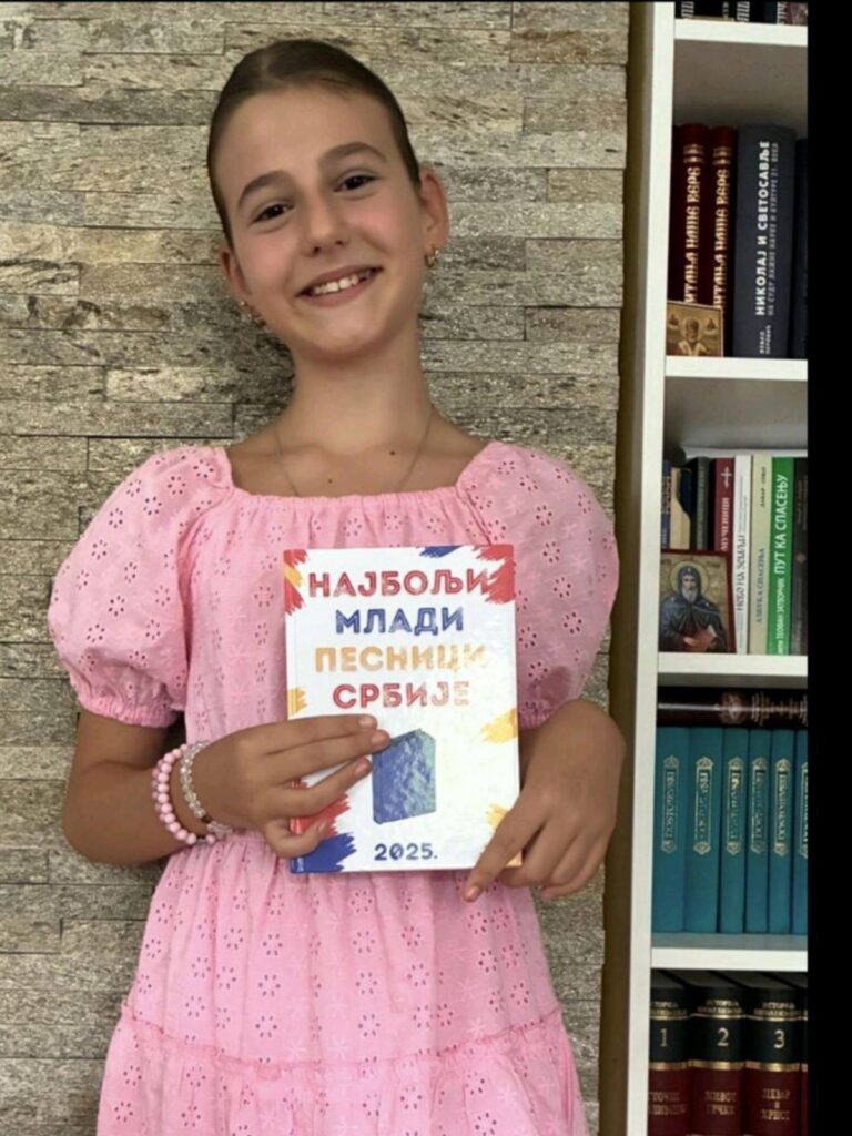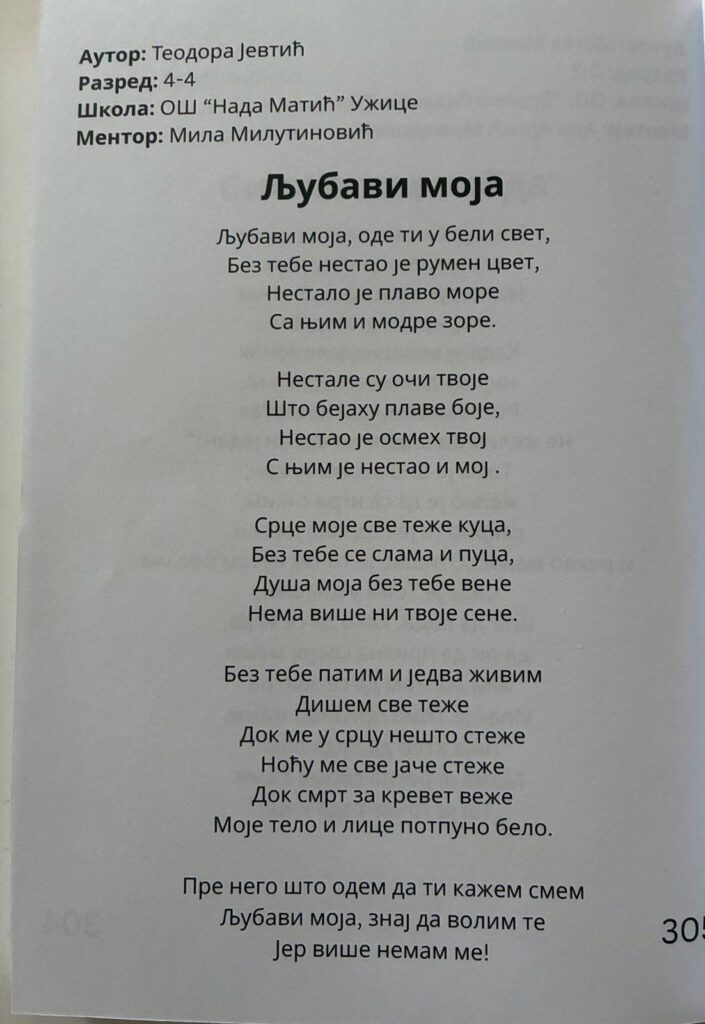 Теодора Јевтић, ученица IV4 Основне школе Нада Матић из Ужица, постигла је велики успех на овогодишњем књижевном конкурсу „Најбољи млади песници Србије“, на којем је њена песма уврштена међу 300 најбољих радова из целе земље.